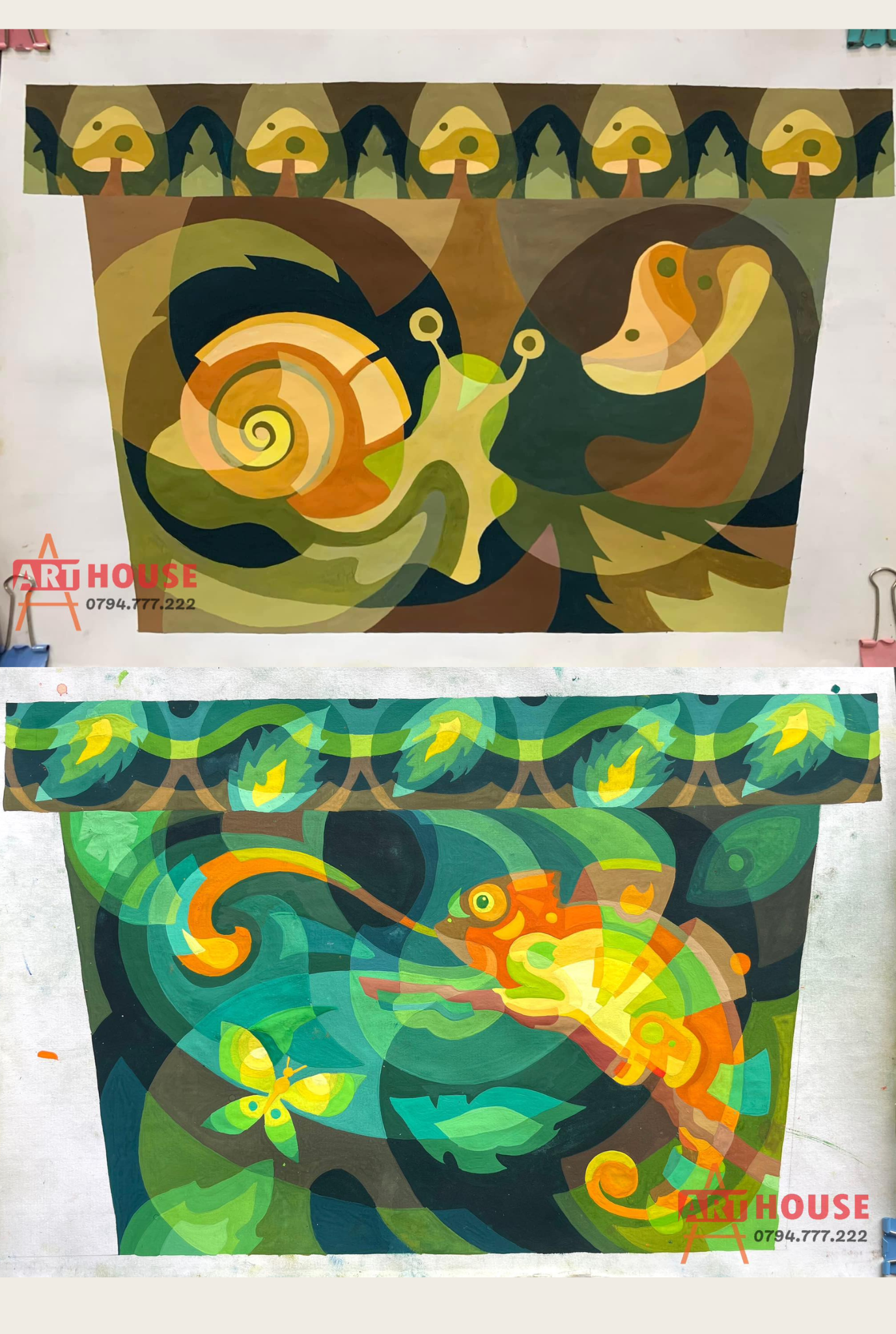 Thực hành đặt màu sắc và họa tiết cách điệu vào không gian bố cục cụ thể, hoàn thiện bài tập về môn trang trí màu cơ bản.