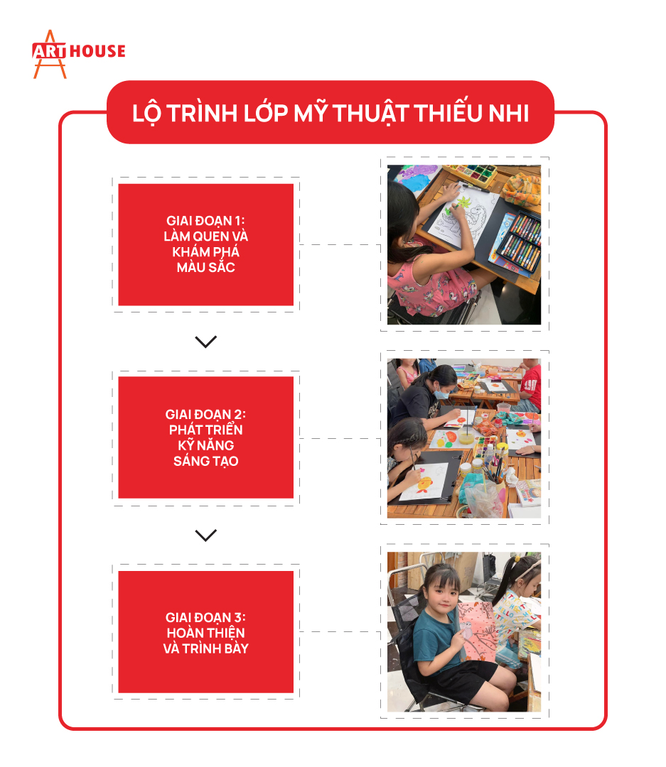 Khoá học Mỹ thuật thiếu nhi là nơi ươm mầm sáng tạo và khơi dậy trí tưởng tượng cho trẻ em từ 6 tuổi trở lên. Thông qua các buổi học vẽ tranh và hoạt động nghệ thuật, trẻ không chỉ phát triển kỹ năng quan sát, tập trung mà còn tăng sự tự tin và khả năng biểu đạt cảm xúc.